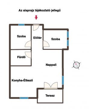 -Nappali, konyha, étkező, 2 hálószoba, fürdőszoba-WC, előtér.