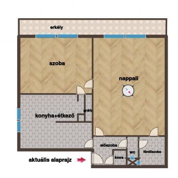 -Jelenlegi elrendezés: 2 szoba + külön konyha és étkező