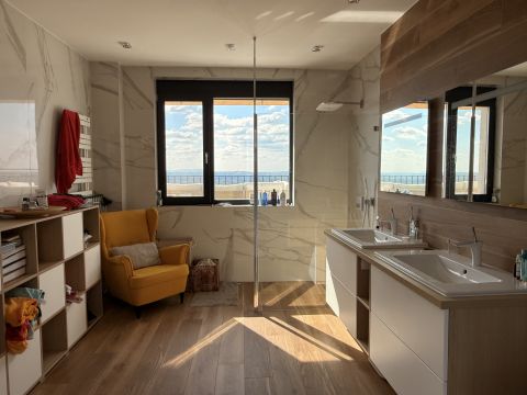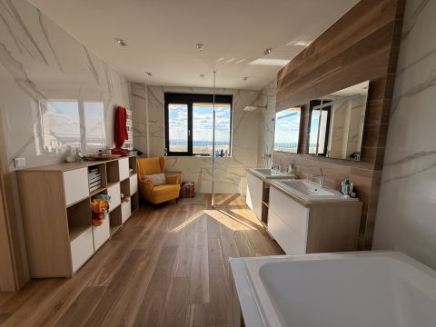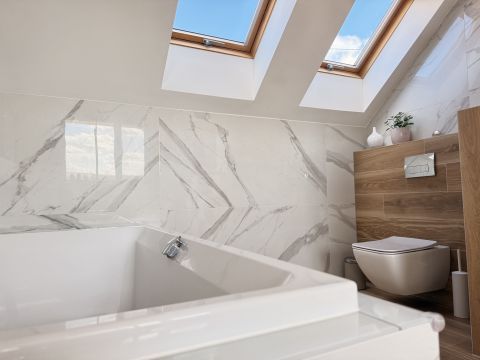 - magas minőségű burkolatok, egyedileg gyártott beépített bútorok, Villeroy & Boch szaniterek, Hansgrohe szerelvények
