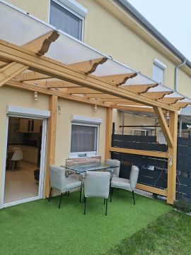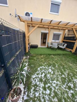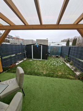 A teraszt polikarbonát napfénytető védi esőtől és hótól, a kert gyepesített, valamint egy 5 m²-es lemez tároló is helyet kapott.