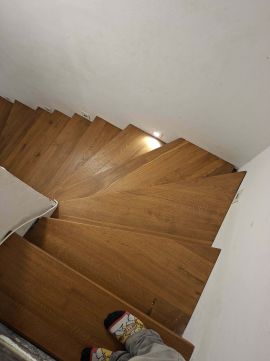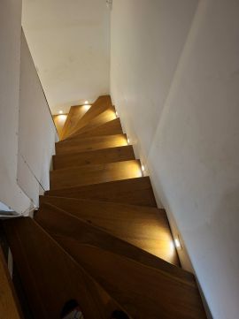 A lépcsőt bükkfenyő fára cserélték, hangulatos LED-es megvilágítással.