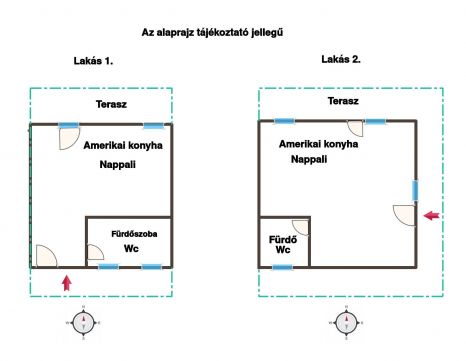 Mindkét lakás: amerikai konyhás nappali + fürdőszoba WC-vel + terasz