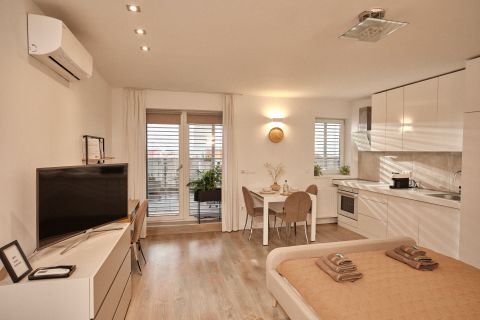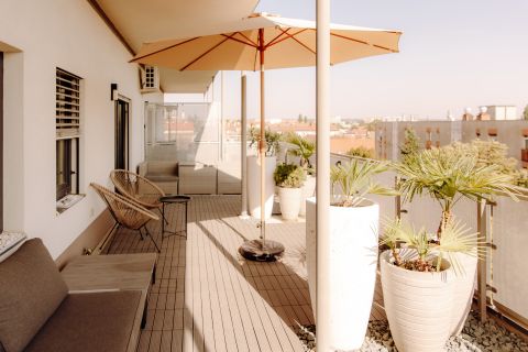 Az ingatlanhoz nagyméretű fedett terasz is tartozik (30 m² és 20 m²), melyek mindkét nappaliból közvetlenül megközelíthetők.