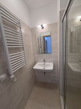 Az ingatlanban három külön nyíló hálószoba található, amelyek a Béke tér irányába tájoltak. A lakás kényelmét két fürdőszoba biztosítja: az egyik fürdőkádas, a másik zuhanyzóval kialakított, emellett külön WC is rendelkezésre áll. A lakásban két előtér került kialakításra, amelyek praktikus és jól szervezett belső elrendezést biztosítanak.