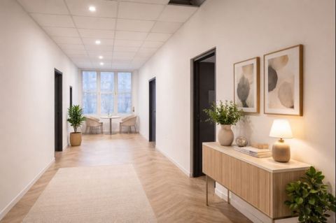 A lakás egy 3 emeletes, korábbi irodaépületből kialakított, rendezett társasház 2. emeletén található.