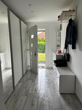 A házba egy praktikus előszobán keresztül lépünk be, melyben beépített szekrények és ruhafogas gondoskodnak a rendről. Innen jutunk a tágas amerikai konyhás nappaliba, mely modern konyhai eszközökkel felszerelt, stílusos bútorokkal berendezett. Az egyik hálószoba az előszobából, míg a másik a nappaliból közelíthető meg. A fürdőszoba és WC szintén a nappaliból nyílik.