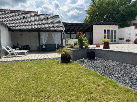 Az udvarban praktikus tárolóhelyiség, valamint egy fedett, nyitott rész is található. A nagy külső grillező és étkező kiváló lehetőség családi és baráti összejövetelekhez, miközben az ápolt, zöld kertben gyönyörködhetünk. Az ingatlan saroktelken fekszik, melyet téglafal vesz körbe, így teljes privát szférát biztosít a lakóknak, annak ellenére, hogy ikerház.