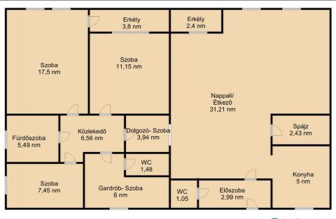 - Alapterület: 115 nm + 3,8 + 2,47 nm erkély