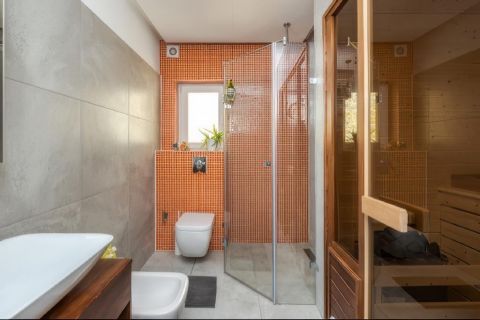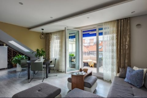 A lakás különlegessége a saját tetőterasz, amely nyugodt menedéket nyújt a város felett, valamint a beépített szauna, amely garantálja a teljes kikapcsolódást.