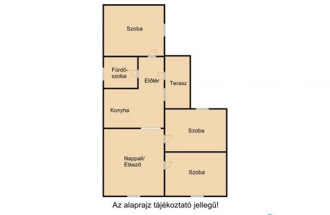Elrendezését tekintve áll: nappali-étkező-konyha, 3 külön nyíló szoba, előszoba, fürdőszoba WC-vel egy helyiségben, terasz