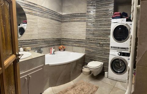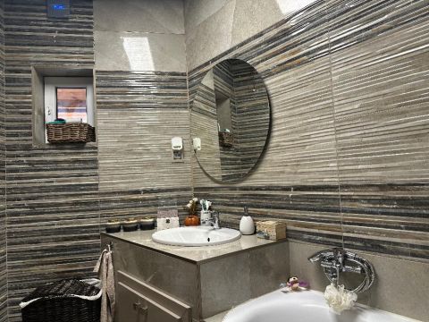 A fürdőszoba káddal, modern burkolatokkal, törölközőszárítóval, wc, mosdóval felszerelt helyet ad a mosó-, szárítógépnek.