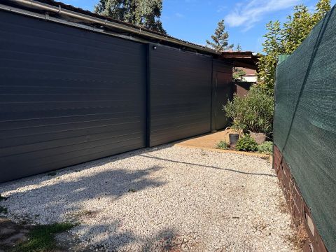 Az ingatlan része a 46 m2-es, két részre osztott garázs motoros kapuval, gépkocsi beállóval, valamint U alakú galériával a praktikus tárolás érdekében és egy kuka tárolóval.