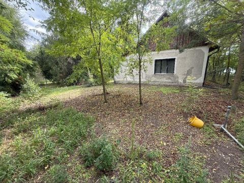 Különálló garázs és melléképület, körbekerített udvar, fák és kisebb erdős rész.