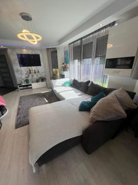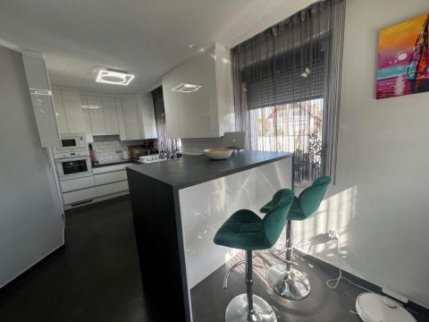 A konyha: modern, letisztult, fehér fényes szekrényekkel ellátott, beépített elektromos sütővel és mikrohullámú sütővel, amely elegáns megjelenést biztosít.