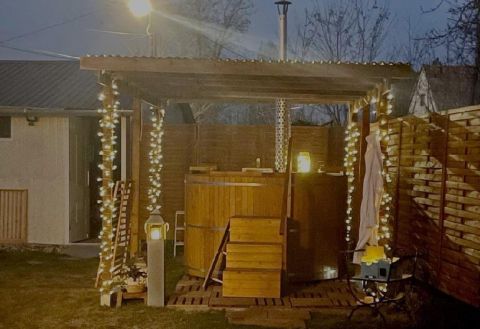 Külső :16 nm fedett terasz, 2 garázs (42 nm és 30 nm) Hörmann elektromos kapukkal, tároló faház( 6 nm), kovácsoltvas kapu, szintén elektromos, rendezett udvar, kültéri dézsafürdő valamint fúrt kút
