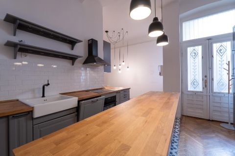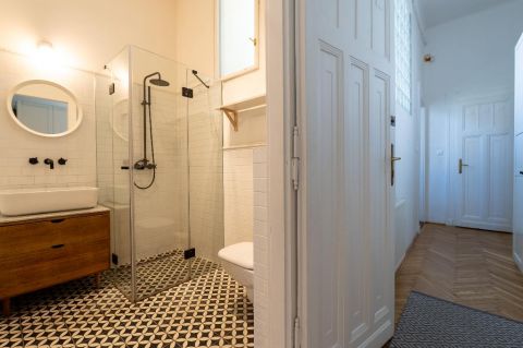 A lakást 7 éve teljeskörűen, igényesen felújították: a nyílászárók megőrizték eredeti karakterüket, de fel lettek újítva; a burkolatok és a beépített bútorok elegánsak, időtállóak.
