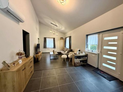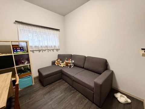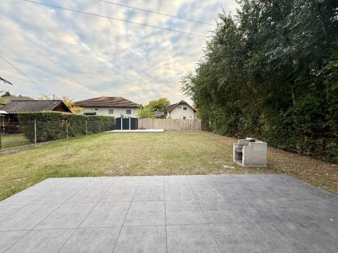 A 75 négyzetméteres lakótér egy 435 négyzetméteres rendezett telken helyezkedik el, amely ideális méretű ahhoz, hogy kényelmes kertet, teraszt és akár medencét is kialakíthasson.