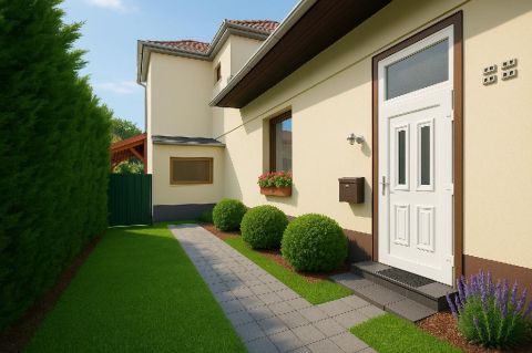 A saját előkert remek hely egy kávézós reggelhez vagy egy baráti terasz kialakításához, ráadásul a tetőtér beépíthető, ha később bővítenéd.