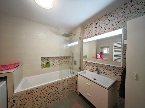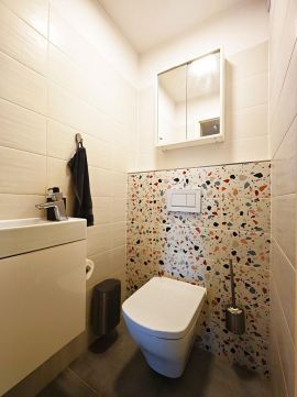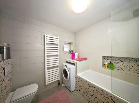 - ablakos, szellőztethető, kényelmes méretű, modern fürdőszoba wc-vel;