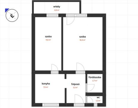 A lakás világos, utcai nézetű, északkeleti tájolású. A 4,8 m2-es erkély a tulajdoni lapon feltüntetett 45 m2-en felül értendő.