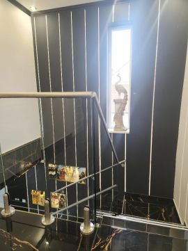 Riasztórendszer, modern világítástechnika, üvegkorlát.