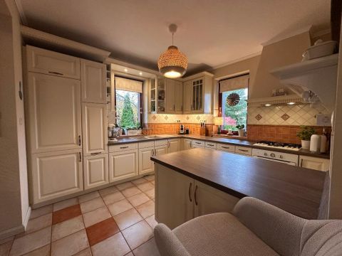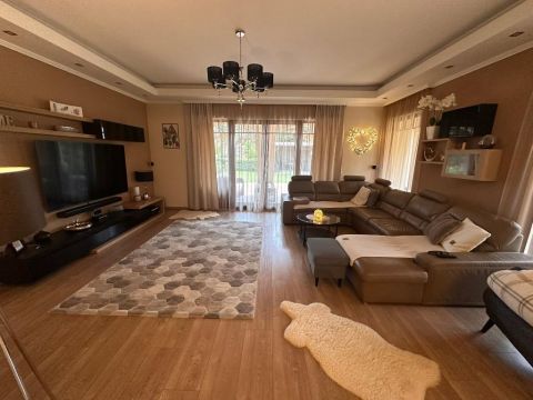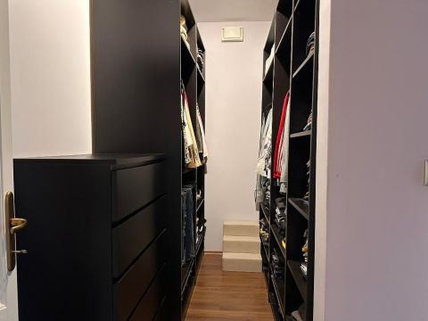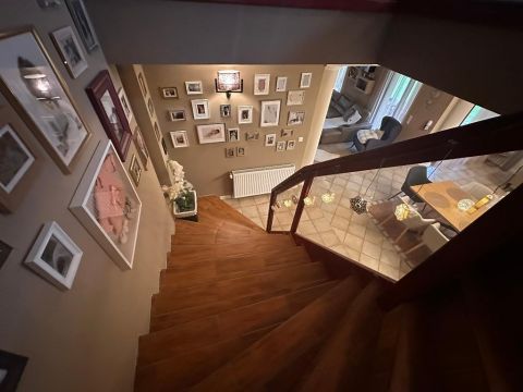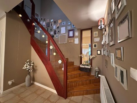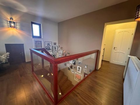 A belső elrendezés szerint a földszinten lévő étkező és nappali is egyaránt 32/35 m2, kényelmes és tágas, az étkező mellett van az emelethez a feljárat és a garázshoz való lejárat. A konyha egy légtérben van az étkezővel. A nappali közvetlenül a kertre néz és egy 62 m2-es terasz veszi körbe. A földszinten kapott helyet egy hálószoba gardróbbal, egy dolgozó szoba, és egy vendégszoba is. A földszinti fürdőben zuhanyzó és kád is van. A mosókonyha egy praktikus külön helyiségben kapott helyet. Az emeleten teljesen el lehet különíteni akár a gyerekeket, akár a hozzánk látogató vendégeket. 2 hálószobához és egy fürdőszobához egy nagy légterű második nappali tartozik. A hálószobákból közös terasz nyílik, pazar kilátással a csodálatos kertre.