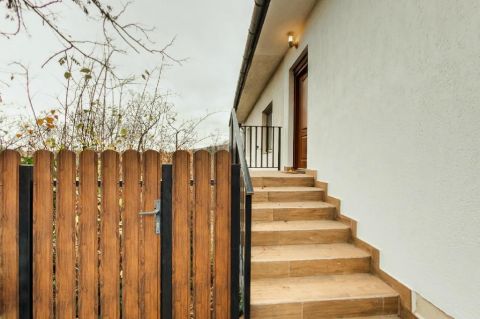 További extrák: a több ponton záródó biztonsági ajtó, riasztórendszer, elektromos kapu, 2 autó számára biztosított a parkolás.