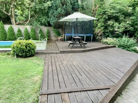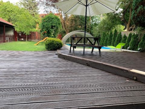 Az 1077 nm-es telken - fenyők, gyümölcsfák, tuják, cserjék gyűrűjében - kíváncsi szemektől elzárva, rendezett közös kertben pihenhetjük ki egy hosszú nap fáradalmait. A szintén közös használatú 8x4 méteres fedhető medence is az új tulajdonosok kényelmét és kikapcsolódását biztosítja.