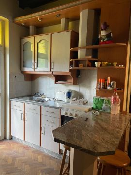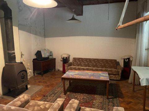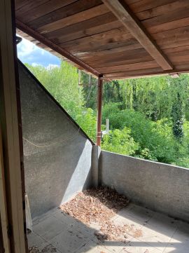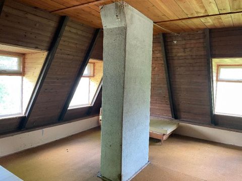 A ház téglából épült, földszintjén egy 30 m2-es, amerikai konyhás nappali - hatalmas ablakokkal - és a fürdőszoba található, ahonnan a teraszra is kijuthatunk. A nappaliból egy nagyon szép, masszív falépcső visz fel az emeletre. A tetőtér egy tágas, egy légterű szoba, melynek teljes területe 35 m2, de az 1,9 m feletti belmagasságú terület is 18 m2, melynek tágas hatását a tetősíkból kiugró ablakok is növelik. Innen egy 3 m2-es loggia is nyílik, melyről a szomszédos erdőre látunk. A ház elektromos- és vízvezetékét a jelenlegi tulajdonos kicseréltette, valamint a tetőtéri ablakokat is hőszigeteltre cseréltette. A ház fűtését egy nagyon jó minőségű kályha biztosítja. Mind a földszinten, mind a tetőtérben nagyon szép a mennyezeti faburkolat.
