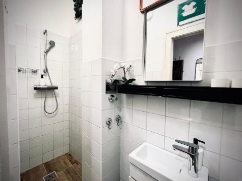 A lakásba lépve egy előszobába jutunk, itt egy hatalmas, L-alakú gardrób is helyet kapott, így a tárolással nem lesz bajunk. Egyenesen továbbhaladva a tágas, többfunkciós szobát találjuk. Jobbra van a konyhasarok, mely kis mérete ellenére tökéletesen felszerelt, minden elvárásnak megfelel. A helyiség földszinti elhelyezkedése ellenére, a déli-délkeleti fekvésének köszönhetően napfényes, jó hangulatú. Szintén az előszobából nyílik a kicsi, de nagyon praktikusan kialakított zuhanyzós fürdőszoba. Az egész lakás korszerű, nagyon jó hangulatú, otthonosan, stílusosan felújított, kiválóan használható.