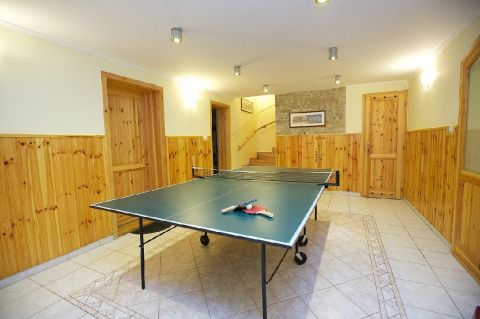 A szuterénben egy nagy társalgó került kialakításra felszerelt konyhával.