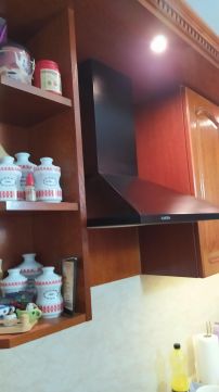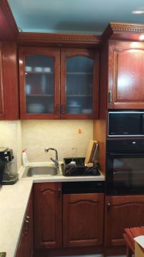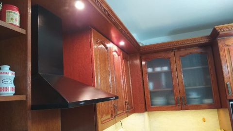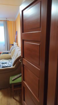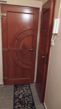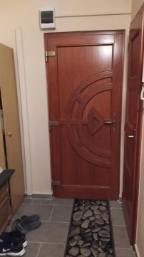 A bejárati ajtó borovi fenyőből van. A belső ajtók borovi fenyőből vannak. A konyhabútor, felülete cseresznyefából, a korpusz része bútorlapból van. A konyhai gépek is prémium minőségűek.