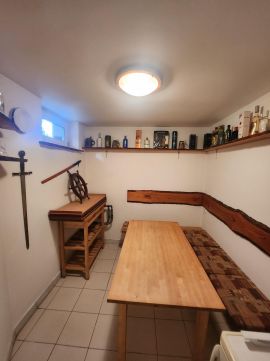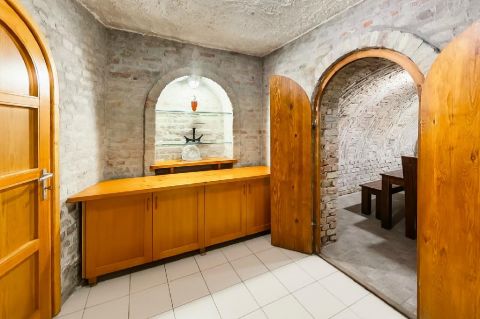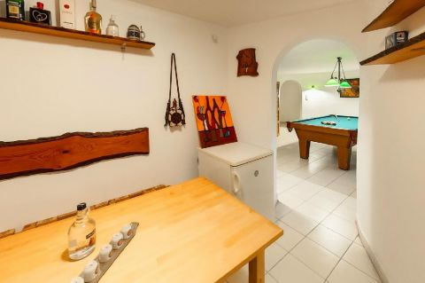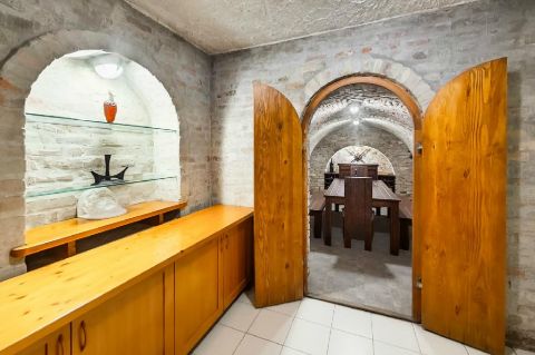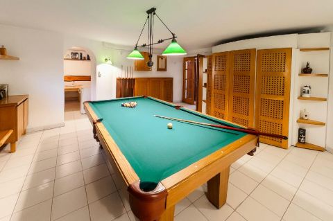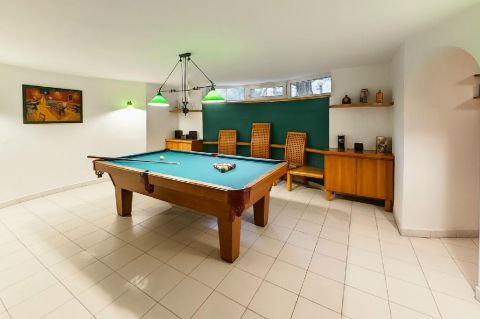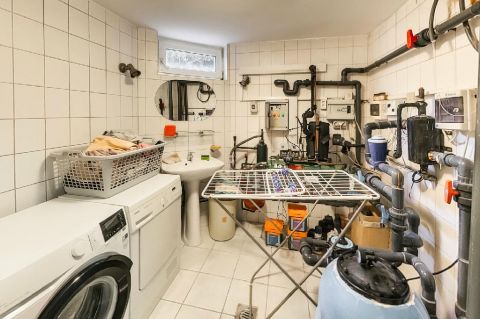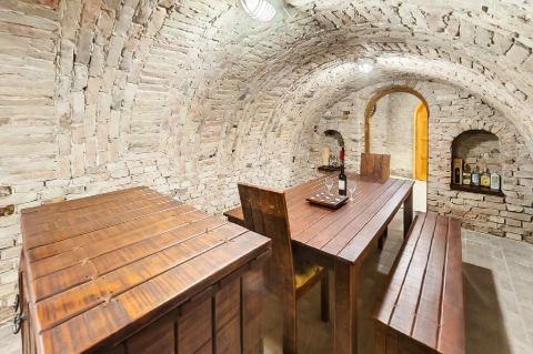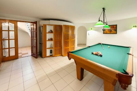 A legalsó szinten kapott helyet, nagy alapterületű, kétállásos garázs, mosókonyha (itt található a medence gépészete is), biliárd szoba, klubhelyiség, hangulatos borospince.