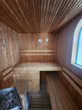 Ezen a szinten került kialakításra a ház egyik különlegessége, az egész évben használható, zárt medencetér, fűthető medencével, finn szaunával, saját zuhanyzó és toalettel.