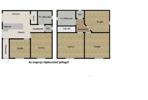 Földszint: Tágas közösségi tér (nappali-étkező 23 nm), konyha, 2 szoba, fürdőszoba, WC.
