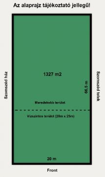 A 1327 m2-es terület 20 méteres utcafronttal elegendő helyet biztosít egy tágas otthon, kert, terasz vagy akár további praktikus megoldások kialakítására is. A telek elhelyezkedése és adottságai miatt ideális választás saját részre történő építkezéshez, de befektetési célra is kiváló lehetőség.