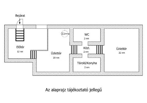 Az ingatlanba néhány lépcsőfokon lehet lemenni, ekkor egy tágas előtérbe jutunk, ami egy kisebb szintkülönbséggel csatlakozik az üzlettérhez. Az egész tér egybefüggő, szép világos és a nagy belmagasságának köszönhetően a térérzet is kiváló.