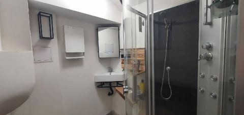 Az üzlettér részből továbbhaladva 2 pici helyiség következik, balra találunk egy zuhanyzós fürdőszobát WC-vel, ami darálós kialakítású, de megbízhatóan működik. Balra egy pici konyha kapott helyet. Továbbhaladva egy tágas, 22 nm-es helyiségbe jutunk, amin ugyan ablak nincs, de hangulatosan kialakítható és elképesztően csendes.