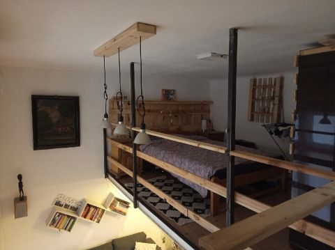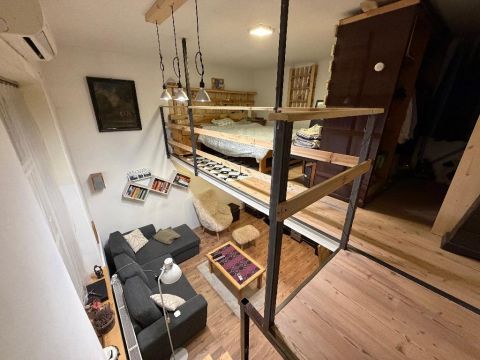 A lakás tulajdoni lap szerint 34 m2-es, 1 szobás, azonban a nagy (4 méteres) belmagasságnak köszönhetően kialakításra került egy 8 m2-es külön bejáratú szoba a konyha felett, valamint egy 11 m2-es galéria a nappaliban. A galérián a belmagasság 1,8 m.