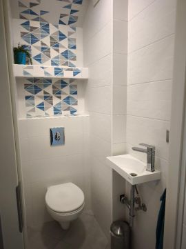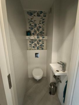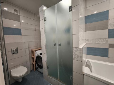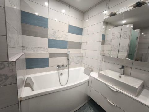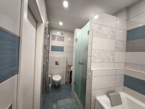 modern fürdőszoba káddal, zuhanyzóval és WC-vel