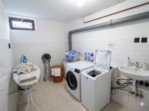 Alagsor: A 100 négyzetméteres, teljesen burkolt, 240 cm belmagasságú alagsorban kapott helyet a 36 négyzetméteres garázs egyedi, vaskeretes faborítású kapuval. Itt található a mosókonyha (külön mosó- és szárítógép kiállással) és a tárolók.