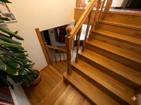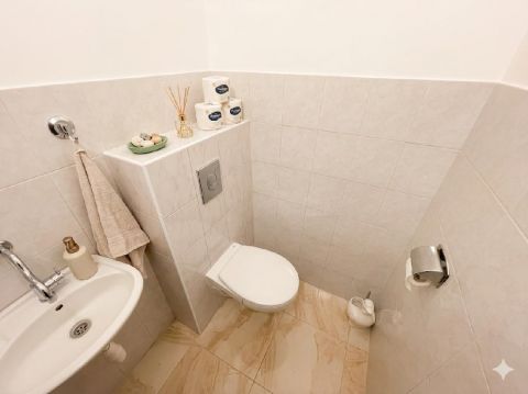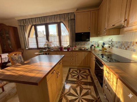 Konyha: A konyha a ház igazi ékköve, ahol egyedi, tölgyfából készült asztalosmunka várja az új lakókat, csendesen záródó ajtókkal és finoman gördülő fiókokkal. A pult prémium fából készült, a beépített gépek pedig magas minőségű Whirlpool márkájúak.