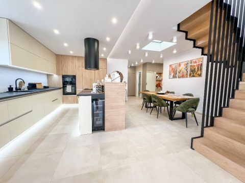 A ház egyik legnagyobb erőssége a tér és az élhetőség: a közel 80 m2-es nappali, konyha, étkező valódi központja a mindennapoknak. Itt egyszerre tudtok együtt lenni, miközben mindenkinek megmarad a saját tere. A nappaliból közvetlen kijárat nyílik a kertbe és a teraszra, ahol már elő van készítve a kinti konyha, így a nyári grillezések és baráti összejövetelek nem logisztikai kihívást, hanem élményt jelentenek.