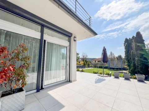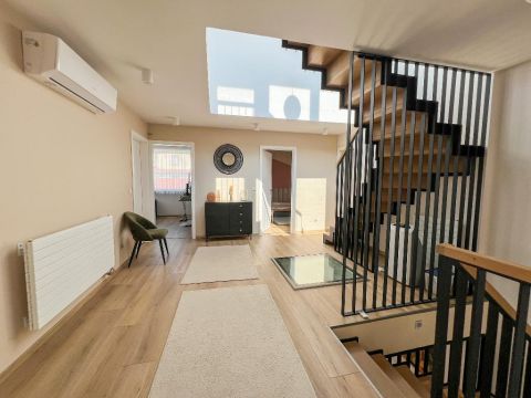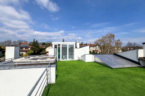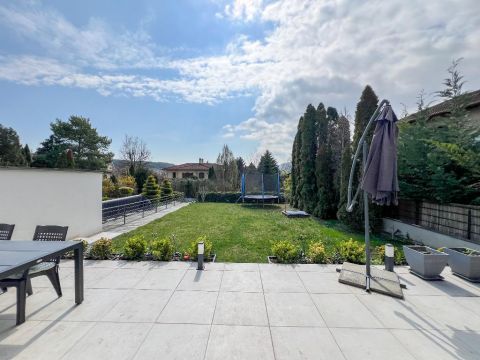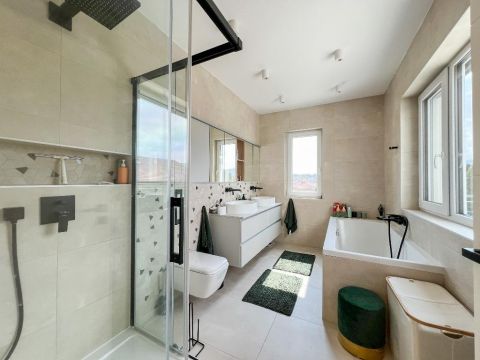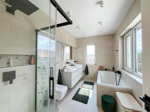 Ami igazán különlegessé teszi ezt az otthont, az a 170 m2-es teraszrendszer, benne egy 80 m2-es panorámás tetőterasszal, ahonnan a Hármashatárhegy látványa minden nap emlékeztet arra, miért jó itt élni. Egy hosszú nap után a jakuzzi és a szauna valódi feltöltődést ad ? mintha saját wellness részleged lenne.