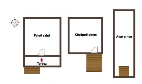 Az ingatlan három szintes kialakítású: két szinten pince és a felső szinten egy szoba áll rendelkezésre. A pincék szárazak, kiválóan alkalmasak tárolásra vagy borérlelésre.