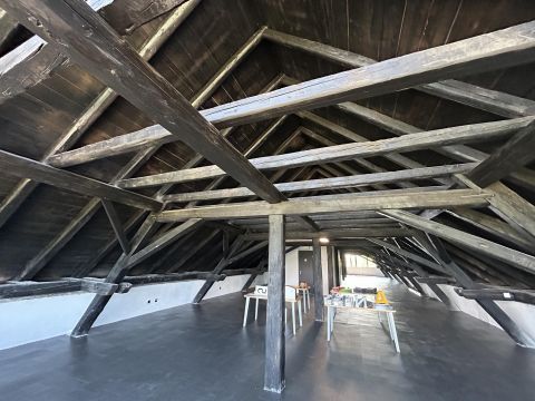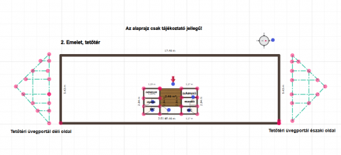 A tetőtér mérete impozáns: nyitott gerincmagasság: 5,5 méter, belső parapet magasság: 1,2 méter, a beltér egybefüggő hossza: 29 méter. A tetőtér két végén 9 méter széles, 4,5 méter magas alumínium keretes, szegmentált ablakok. A földszinten és az 1. emeleten 35 db azonos méretű, korszerű, alumínium profilos, 3 rétegű üveggel ellátott nyílászárók, rejtett alumínium redőnnyel felszerelve.
