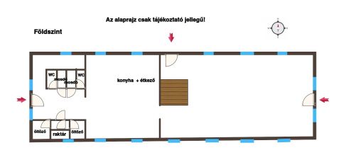 Az épületnek három bejárata van: 1 méter ill. 1,8 méteres ajtók az ingatlan két rövidebb oldalán, a hosszanti közepén pedig egy 1,8 méteres ajtó található.