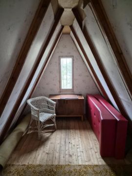 A másik épület galériás, szocreál stílusú hangulatot idéz, karakteres megjelenésével igazi egyedi atmoszférát teremt. A galéria praktikus hálórészként vagy alkotótérként is használható igazi kreatív kuckó 21 m2 + pince és terasz.