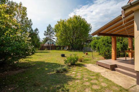 Gondozott kert és fedett terasz -20 m²-es fedett terasz, amely tökéletes hely a pihenésre. - A terasz alatt egy 5 m² pince található -10 m²-es kerti tároló, amely ideális biciklik és kerti eszközök tárolására. -A ház körbejárható, így teljesen privát tér alakítható ki.