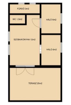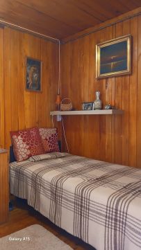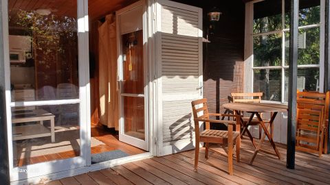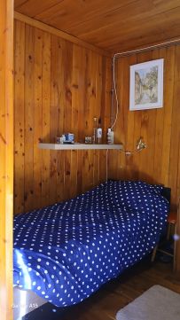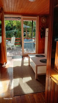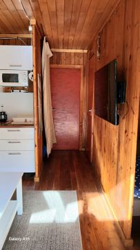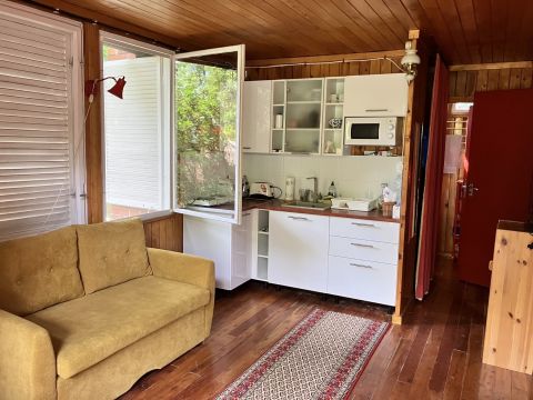 A hangulatos faház nagy teraszán keresztül juthatunk a nappali/konyha helységbe ahonnan az egyik kis hálószoba nyilik,